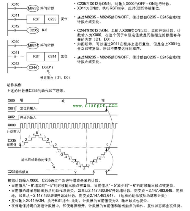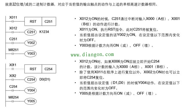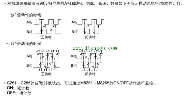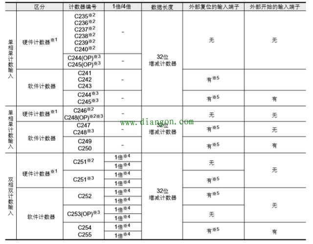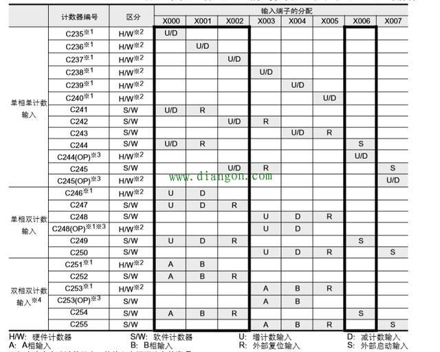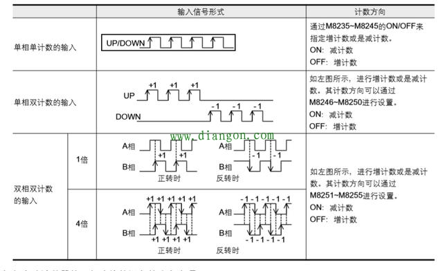 计数器是plc内部重要的软元件之一,高速计数器是PLC计数器中常用的一种,PLC 内部有两种计数器,一种是对PLC内部信号进行计数的计数器,另一种是对外部事件信号进行计数的计数器。 一:高速计数器种类和软元件编号 1、高速计数的种类 基本单元内置了32位增减计数器的高速计数器(单相计数/单相双计数/双相双计数),根据计数方法的不同可以分为硬件计数器和软件计数器两种 在高速计数器中,提供了可以选择外部复位输入端子和外部启动输入端子开始计数的功能。 2、高速计数器的区分 硬件计数器: 这种计数器是通过硬件进行计数。 软件计数器:这种计数器是通过CPU中断处理进行计数,每个计数器需要在最大响应频率和综合频率的两个限制条件下使用。 3、高速计数器的种类和输入信号的形式