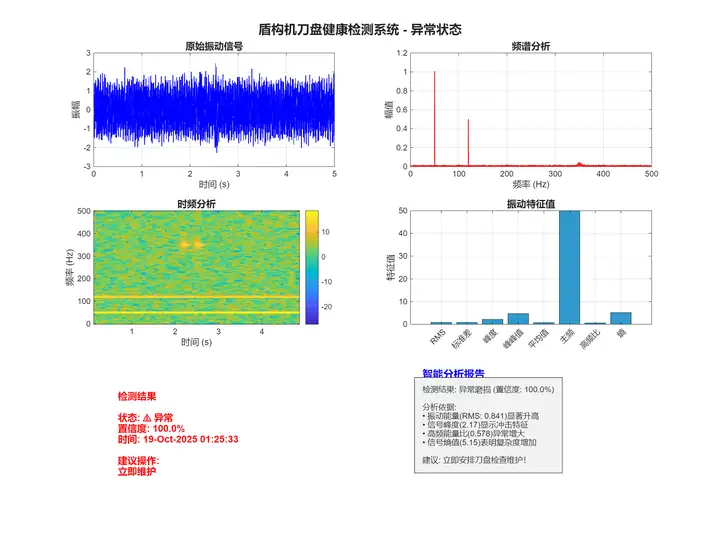 去年在某货轮上测试时,发生了 —— 推进器齿轮磨损导致转速下降,系统提前 15 分钟报警,避免了海上停机。 案例 3:盾构机刀盘磨损检测 —— 振动信号 + LLM 增强识别 今年参与地铁盾构机项目时,遇到个难题:刀盘轻微磨损时振动信号变化很小,传统模型经常误报。后来用 MATLAB 的 LLM 增强功能,把检测准确率从 82% 提到了 97%。 步骤 1:振动数据采集与预处理 盾构机刀盘上装了 3 个振动传感器,采样率 10kHz,先提取时频特征: matlab