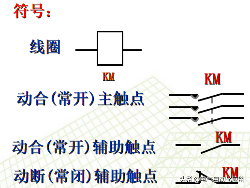1.1 组合开关(转换开关) 组合开关有三对静触片——相当于刀开关的夹座,三个动触片——相当于刀开关的闸刀。用 手柄转动转轴使动触片与静触片接通与断开。 1.2 按钮;通常接触器线圈的的通电和断电是用按钮控制的。 1.3 交流接触器接触器 用刀开关和电磁铁结合在一起的控制电器叫做接触器或电磁开关。 接触器是各种电器控制设备中主要电器,利用它可以实现各种自动控制的要求。 动作过程:1线圈通电。2 衔铁被吸合。3 触点闭合。4 回路与电源接通。 注意:属于同一器件的线圈和触点用相同的文字表示。 用于主电路 流过的大电流 (需加灭弧装置) 用于控制电路流过的小电流 (无需加灭弧装置) 1.4 中间继电器 作用:常用来传递信号或用于控制电路中。 其结构和交流接触器基本相同。 区别: 交流接触器的主触点可以通过大电流; 继电器的体积和触点容量小,触点数目多,且只能通过小电流。所以,继电器一般用于控制电路中。 常用继电器类型:1 中间继电器2 速度继电器3 时间继电器(具有延时功能)4 热继电器(做过载保护) 1.5 热继电器 为了保护电动机不受长期过载电流的危害,在电动机控制电路中常装有双金属片热力继电器——过载保护。 工作原理:将两种膨胀系数不同的双金属片紧紧地碾压在一起,当它受热膨胀时,由于不同的金属膨胀系数不同,所以两种金属的膨胀程度不同。 热继电器的主要部分是两个热元件,它是一段电阻不大的电阻丝,绕在双金属片上。使用时,发热元件接入电机主电路,若长时间过载,双金属片被加热。因双金属片的下层膨胀系数大,使其向上弯曲,杠杆被弹簧拉回,常闭触点断开。 常闭触点接在控制电路中,当它断开时,就切断了控制电路,使继电器线圈断电,于是就切断了电动机的主电路,起到了过载保护的作用。 热继电器的主要技术数据——整定电流。 整定电流:即热元件中通过的电流超过此值的20%时,热继电器应在20分钟内动作。 通常是根据整定电流选择热继电器,整定电流与电动机的额定电流基本一致。 1.6 熔断器 用于低压线路中的短路保护。熔断器包含保险丝,保险片,保险管。 常用的熔断器:1插入式熔断器,2螺旋式熔断器3,管式熔断器 4有填料式熔断器 二 主要的控制电路图;1 鼠笼式电动机直接起动的控制线路
