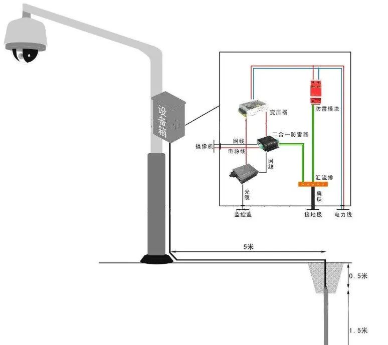关于防雷接地,一直是电气人的重点与难点,也有朋友问到,为什么要做防雷接地?哪些项目需要做防雷? 基本上电气设备都要做接地的,这里通过一个视频防雷前后对比,我们一起来了解建筑、项目防雷接地的重要性。防雷设备接地主是要雷电过电流过大,多个重复接地体起到分流,和防止地位反击的效果。 在弱电行业有不少项目需要做防雷接地,其中最常见的就是机房、监控、线路工程等项目的防雷接地,下面我们来总结这三种防雷接地做法。 一、机房项目如何做防雷接地? 1、接地的方法: 直流地悬浮法即直流地不接大地,与地严格绝缘; 直流地接地法,把计算机等设备中数字电路等的电位点地和网络。 无论采用何种形式,均须有接地母线,接地地杖,在此特别强调建议采用接地埋接地网络板,能更好的引导至大地,接地时应注意如下问题: Ø 尽量不要在机房内把直流地和交流工作地短路或混接; Ø 不允许交流线路与直流地线平行敷设,以防止干扰或短接; Ø 直流地线网应装接在地板下,便于边接,即可减小接地电阻,便于泄流。 2、接地铜排 室内机房接地采用30*5(宽*厚,单位mm)规格之铜片,围绕机房墙壁一周离地面10cm高,且与室外接地体母线相连接。在铜片每隔50 cm钻一小孔,以利于分布在机房各区域的设备进行接地。 3、接地铜板 接地铜板采用宽60mm(厚10mm)之L型铜板固定于楼板,此铜墙铁壁板作为所有应与机房接地之设施的总接地。 4、地网 机房有架设高架地板,则应以2.5mm之多芯裸铜线缠绵高架地板柱做地网。 5、安防接地电阻 安全保护接地、直流工作接地、防雷接地分设时,接地电阻值应符合以下规定: ①安全保护接地,接地电阻不应>10Ω; ②直流工作接地,接地电阻不应>4Ω; ③防雷接地,接地电阻不应>10Ω。 采用角钢50×50×5mm,长1.5m~2.5m;角钢与角钢的连接用扁钢,间隔≥4~5m,角钢≥40×4mm;引线采用50mm2多股铜芯绝缘线或按设计规定;引线与扁钢连接采用焊接,焊接点需进行防腐处理; 二、监控项目如何做防雷接地? 端设备防雷 1、前端设备如摄像头应置于接闪器(避雷针或其它接闪导体)有效保护范围之内。当摄像机独立架设时,避雷针最好距摄像机 3-4 米的距离。如有困难避雷针也可以架设在摄像机的支撑杆上,引下线可直接利用金属杆本身或选用Φ8 的镀锌圆钢。为防止电磁感应,沿杆引上摄像机的电源线和信号线应穿金属管屏蔽。 4、 室外的前端设备应有良好的接地,接地电阻小于4Ω,高土壤电阻率地区可放宽至 <10Ω。 整体设备防雷接地结构如下两张图: 三、传输线缆如何做防雷接地? 1、、传输部分的线路在城市郊区、乡村敷设时,可采用埋地敷设方式。当条件不充许时,可采用通信管道或架空方式,此时规定了传输线缆与其它线路其沟的最小间距和与其它线路共杆架设的最小垂直间距。 2、 从防雷角看,埋地敷设方式防雷效果最佳,架空线最容易遭受雷击,并且破坏性大,波及范围广,为避免首尾端设备损坏,架空线传输时应在每一电杆上做接地处理,架空线缆的吊线和架空线缆线路中的金属管道均应接地。 3、传输线埋地敷设并不能阻止雷击设备的发生,大量的事实显示,雷击造成埋地线缆故障,大约占总故障的 30%左右,即使雷击比较远的地方,也仍然会有部分雷电流流入电缆。所以采用带屏蔽层的线缆或线缆穿钢管埋地敷设,保持钢管的电气连通。 对防护电磁干扰和电磁感应非常有效,这主要是由于金属管的屏蔽作用和雷电流的集肤效应。如电缆全程穿金属管有困难时,可在电缆进入终端和前端设备前穿金属管埋地引入,但埋地长度不得小于 15 米,在入户端将电缆金属外皮、钢管同防雷接地装置相连。 ![]() |