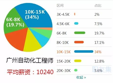 排名第五的是广州 自动化工程师平均薪资是10240 10K-15K的占比达到了34% 同时10K以下的薪资占比增加