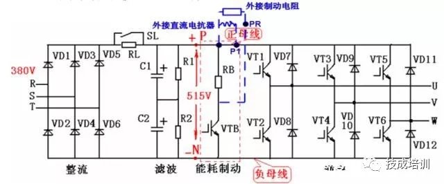 a、主电路结构 该电路是现在通用的低压变频器主电路图。不管什么品牌的变频器,其主电路结构基本如此。因为:整流电路和逆变电路是两个标准模块,没有变化的空间。