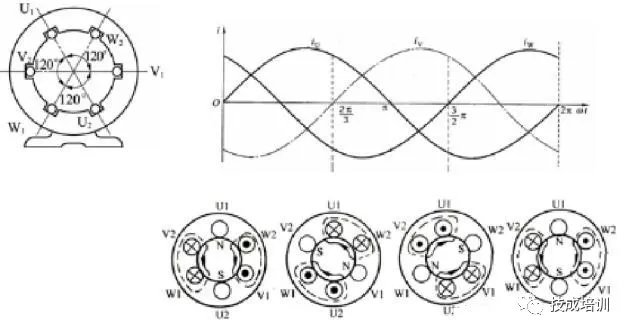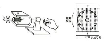在一个可旋转的马蹄型磁铁中间,放置一只可转动的笼型短路线圈。当转动马蹄形磁铁时,笼型转子就会跟着一起旋转。这是因为当磁铁转动时,其磁感线(磁通)切割笼型转子的导体,在导体中因电磁感应而产生感应电动势,由于笼型转子本身是短路的,在电动势作用下导体中就有电流流过 。该电流又和旋转磁场相互作用,产生转动力矩,驱动笼型转子随着磁场的转向而旋转起来,这就是异步电动机的简单旋转原理。 在定子三相对称的定子绕组中通入对称三相电流即在气隙中产生旋转磁场。