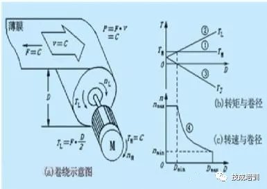 矢量控制是交流电动机用模拟直流电动机的控制方法来进行控制。 1)将控制信号按直流电动机的控制方法分为励磁信号和电枢信号 2)将控制信号按三相交流电动机的控制要求变换为三相交流电控制信号,驱动变频器的输出逆变电路。 变频器控制方式:分为无传感器(开环)和有传感器(闭环)两种控制方式。无传感器控制方式是通过变频器内部的反馈形成闭环。 控制特点:矢量控制是对电动机的转速(转矩) 进行控制,不能对电动机的间接控制量进行控制。 1)使用前要进行自扫描,将电动机的参数扫入变频器。 2)一台变频器只能控制一台电动机。 3)矢量控制既能控制电动机的电流幅值,同时又能控制电流的相位(矢量控制名称的由来)。 ★性能特点:可从零转速进行控制,调速范围宽;可对转矩进行精确控制,系统响应速度快,速度控制精度高。 4、转矩控制 直接转矩控制技术,英语称为DSC或DTC控制,是继矢量控制技术之后又一种具有高控制性能的交流调速技术。直接转矩控制是利用空间矢量、定子磁场定向的分析方法,直接在定子坐标系下分析异步电动机的数学模型,计算与控制异步电动机的磁链和转矩,采用离散的两点式调节器(Band-Band控制),把转矩检测值与转矩给定值作比较,使转矩波动限制在一定的转差范围内,转差的大小由频率调节器来控制,并产生PWM脉宽调制信号,直接对逆变器的开关状态进行控制,以获得高动态性能的转矩输出。直接转矩控制完成了交流调速的又一次飞跃。 直接转矩控制也是一对一控制,不能一台变频器控制多台电动机,且不能用于过程控制。 在各种薄膜或线材的收卷或放卷过程中,要求被卷物的张力F必须保持恒定即F=C,为此:
