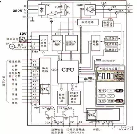 b、变频器控制电路 任何品牌的变频器,其内部功能框图是一样的,因为变频器要保证正常工作,必须要有相应的功能。变频器主要包括: 主电路、电流保护电路、电压保护电路、过热保护电路、驱动电路、稳压电源、控制端子、接口电路、操作面板、CPU等。