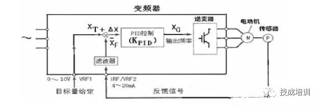 该控制是一种闭环控制。控制方式有两类:一是用速度传感器将电动机的转速作为反馈信号,以提高电动机的速度控制精度;另一类是将间接物理量如压力、流量、温度等通过传感器转换为电信号,反馈回变频器,以提高这些间接控制量的控制精度。