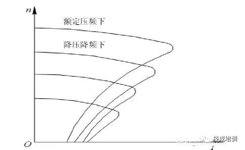 2、旋转磁场的转速 在以上的分析中,旋转磁场只有一对磁极,即p=1,当电流变化一个周期,旋转磁场正好在空间转过一周。对50Hz工频交流电而言,旋转磁场每秒在空间旋转50周,n1=60f1=60×50r/min=3000r/min。若磁场有两对磁极,p=2,则电流变化一周,旋转磁场只转过0.5周,比磁极对数p=1情况下的转速慢了一半,即n1=60f1/2=1500r/min。同理,在3对磁极p=3情况下,电流变化一周,旋转磁场仅旋转了1/3周,即n1=60f1/3=1000r/min。以此类推,当旋转磁场有p对磁极,旋转磁场的转速为: n1=60f1/p 因此, 只要平滑地调节异步电动机的定子供电频率f1, 就可以平滑调节异步电动机的同步转速n1。由于转子是跟随旋转磁场同步旋转的, 转子转速为n=n1(1-s), 所以变频能通过同步转速的改变实现异步电动机的无级调速。 表面看来,只要改变定子电压的频率f1就可以调节转速的大小,但是事实上,只改变f1并不能正常调速。参考异步电动机的电压方程 U1≈E1=4.44f1 K1 N1 Φ 假设现在只改变f1进行调速, 设供电频率f1上下调节, 而供电电压U 1 不变, 因为K1 N1常数, 则异步电动机的主磁通Φ必将改变: 如f1向上调, 则Φ会下降, 这使得拖动转矩T下降,因为T=C TΦI2cosφ2 , 电动机的拖动能力会降低, 对恒转矩负载会因拖不动而堵转; 如f1 向下调, 则Φ会增强, 这会带来更大的危险, 因为电机铁磁材料的磁化曲线不是直线而具有饱和特性, 设计电机时为了建立更强的磁场, 其工频下的工作点已经接近磁饱和, 如再增强磁场势必引起励磁电流(体现在定子电流上)急剧升高, 最终烧坏电机。 由上可知, 只改变频率f 实际上并不能正常调速。在许多场合, 要求在调节定子供电频率f 的同时, 调节定子供电电压U 的大小, 通过U 和f 的不同配合实现安全的调频调速。 由于Φ∝E1 /f1≈U1 /f1, 故调节三相异步电动机的供电频率f1 时,按比例调节供电电压的U1的大小可以近似实现Φ为常数。以星形接法的电机为例, 变频调速时, 如供电50 Hz对应220 V相电压(一般为额定点), 则25 Hz需提供110 V相电压, 10 Hz需提供44 V相电压。