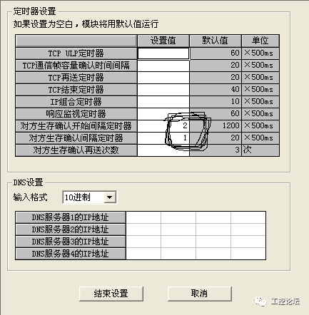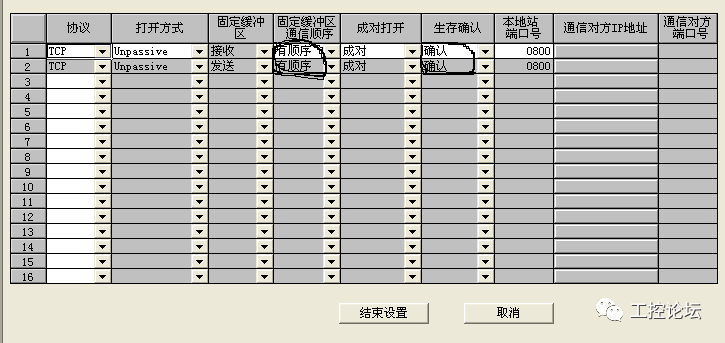 上图是选择TCP通讯协议时的情况,图中铅笔圈定的两个地方要注意,第一处一定要选“有顺序”否则会引起通讯失败,第二处一定要选 “确认”,这样才能与上一图中的设置相对应,否则会导致通讯恢复需要很长时间。