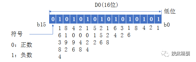 五、数据寄存器(D) 数据寄存器是用来存放数据的软元件,其表示符号位D,按十进制编号。一个数据寄存器可以存放16位二进制数,器最高位(符号位为0:正数;符号位为1:负数),一个数据寄存器可以存放-32768~+32767范围的数据。16位数据寄存器的结构如下:
