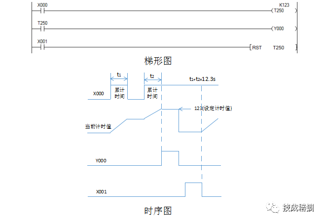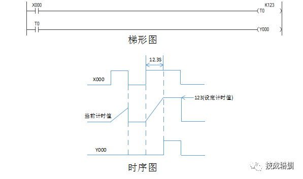 一般型定时器的使用(a) (a)、图中的定时器T0为100ms普通型定时器,其设定值为123(123*0.1s=12.3s)。当X000触点闭合时,T0定时器为ON,开始计时,如果当前计时值未到123时T0定时器输入变为OFF(X000触点断开),定时器T0马上停止计时,并且当前计时值复位为0,当X000触点再闭合时,T0定时器重新开始计时。
