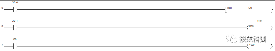 加计数器的使用如图所示,C0是一个普通型的16位加计数器。当X010触点闭合时,RST指令将C0计数器复位(状态值变为OFF,当前计数值变为0),X010触点断开后,X011触点每闭合断开一次(产生一个脉冲),计数器C0的当前计数值就递增1,X011触点第10次闭合时,C0计数器的当前计数值达到设定计数值10,其状态值马上变为ONC0常开触点闭合,Y000钱圈得电。