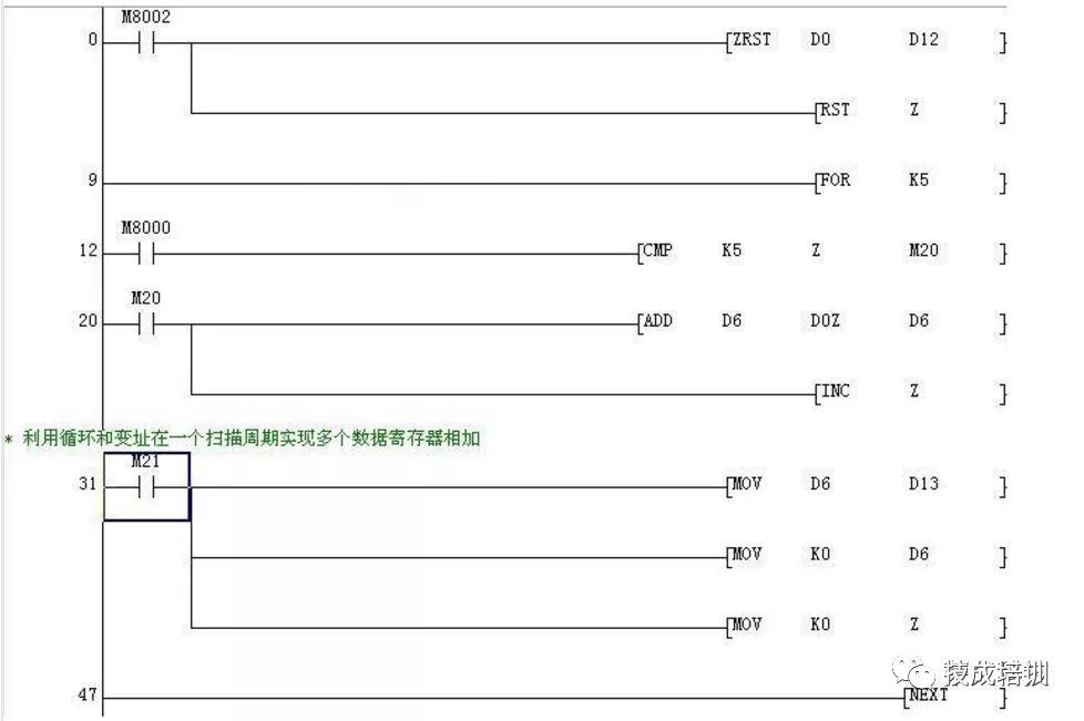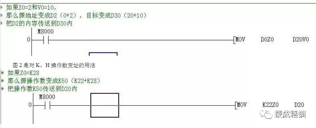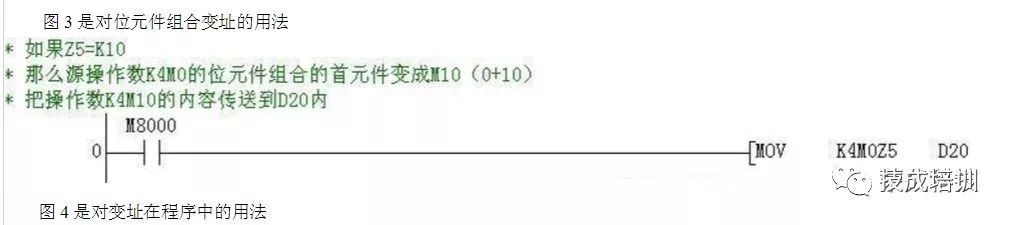 例如V0=5,若执行D20V0,则实际被执行的元件为D25,(D20+5)。变址寄存器可以像其他数据寄存器一样读写,需要进行32位读写时,可将V、Z串联使用(Z为低位,V为高位)。