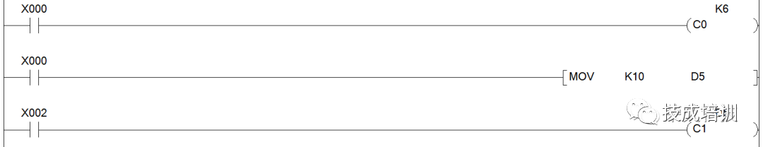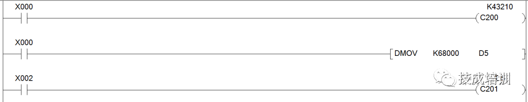 C200计数器的计数值采用直接设定方式,直接将常数43210设为计数值,C201计数器的计数值采用间接设定方式,由于计数值为32位,故需要先用DMOV指令(32位数据传送指令)将常数68000传送到2个16位数据寄存器D6、D5中,然后将D6、D5中的值指定为计数值,在编程时只需输入低编号数据寄存器,相邻高编号数据寄存器会自动占用。