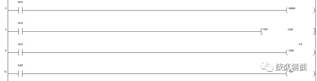 当X012触点闭合时,M8200继电器状态为ON,C200计数器工作方式为减计数X12触点断开时,M8200继电器状态为OFF,C200计数器工作方式为加计数。当x013触点闭合时,RST指令对C200计数器进行复位,其状态变为OFF。