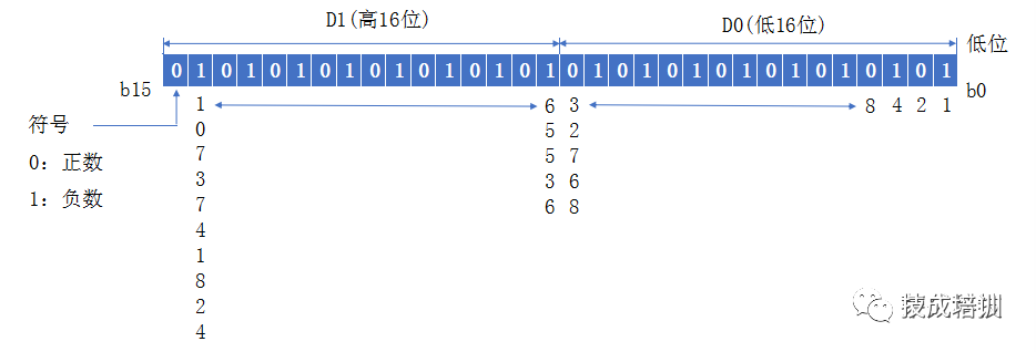 两个相邻的数据寄存器组合起来可以构成一个32位的数据寄存器,能存放32 位二进制数,其最高位为符号位(0——正数;1——负数),两个数据寄存器组合构成的32 位数据寄存器存放-2147483648~+ 2147483647范围的数据。32位数据寄存器的结构如下: