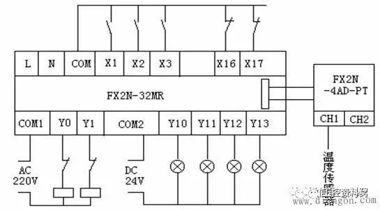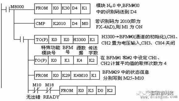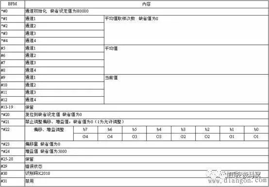 FX2N常用的模拟量输出模块有FX2N-2DA、FX2N-4DA、FX2N-8DA模拟量输出模块。FX—2DA为2通道12位D/A转换模块,是一种具有高精确度的输出模块。通过简易的调整或根据可编程控制器的指令可改变模拟量输出的范围。瞬时值和设定值等数据的读出和写入用FROM/TO指令进行。 FX-2DA的技术指标 二、模拟量模块使用 (一)确定模块的编号 在FX系列可编程控制器基本单元的右侧,可以连接最多8块特殊功能模块,它们的编号从最靠近基本单元的那一个开始顺次编为0~7号。如图:该配置使用FX2N48点基本单元,连接FX-4AD、FX-4DA、FX-2AD3块模拟量模块,它们的编号分别为0、1、2号。这3块模块不影响右边2块扩展的编号,但会影响到总的输入输出点数。3块模拟量模块共占用24点,那么基本单元和扩展的总输入输出点数只能有232点。 (二)缓冲寄存器(BFM)分配 FX系列可编程控制器基本单元与FX—4AD、FX—2DA等模拟量模块之间的数据通信是由FROM指令和TO指令来执行的,FROM是基本单元从FX—4AD、FX—2DA读数据的指令,TO是从基本单元将数据写到FX—4AD、FX—2DA的指令。实际上读、写操作都是对FX—4AD、FX—2DA的缓冲寄存器BFM进行的。这一缓冲寄存器区由32个16位的寄存器组成,编号为BFM#0一#31。 (三)FX-4AD模块BFM的分配表 (四)编程举例 FX-4AD模拟量输入模块连接在最靠近基本单元FX2N-48MR的地方,那么它的编号为N0,如果仅开通CH1和CH2两个通道作为电压量输入通道,计算平均值的取样次数定为4次,可编程控制器中的D0和D1分别接收这两个通道输入量平均值数字量,并编梯形图程序。 梯形图 案例:制冷中央空调温度控制 一、动作要求分析 该制冷系统使用两台压缩机组,系统要求温度在低于12℃时不起动机组,在温度高于12℃时两台机组顺序起动,温度降低到12℃时停止其中一台机组。要求先起动的一台停止,温度降到7.5℃时两台机组都停止,温度低于5℃时,系统发出超低温报警。 在这个控制系统中,温度点的检测可以使用带开关量输出的温度传感器来完成,但是有的系统的温度检测点很多,或根据环境温度变化要经常调整温度点,要用很多开关量温度传感器,占用较多的输入点,安装布线不方便,把温度信号用温度传感器转换成连续变化的模拟量,那么这个制冷机组的控制系统就是一个模拟量控制系统。对于一个模拟量控制系统,采用可编程控制器控制,控制性能可以得到极大的改善。在这里可以选用FX2N-32MR基本单元与FX2N-4AD-PT模拟量输入单元,就能方便的实现控制要求。 中央空调温度控制I/O分配表