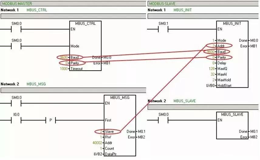 必须要保证主站与从站的“Baud”和 “Parity” 的参数设置要一致,并且程序块 "MBUS_MSG" 中的 "Slave" 地址要与程序块 "MBUS_INIT" 中的 "Addr" 所设置的一致 (见图. 02)。