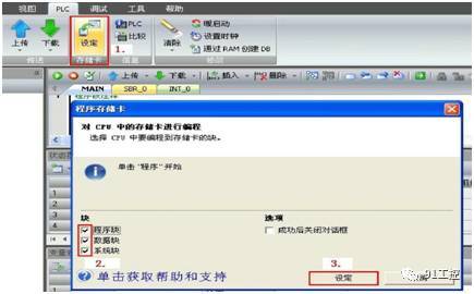 给 CPU 上电,CPU 会自动识别存储卡为程序传输卡并且自动将其中的内容复制到 CPU 内部存储器,传输过程中RUN 指示灯和STOP指示灯以 2 HZ 的频率交替点亮。