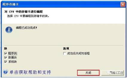 当 Micro/WIN SMART 显示编程操作成功执行时(“编程存储卡”对话框显示编程成功,点击“关闭”)如图所示,从CPU上取下存储卡。