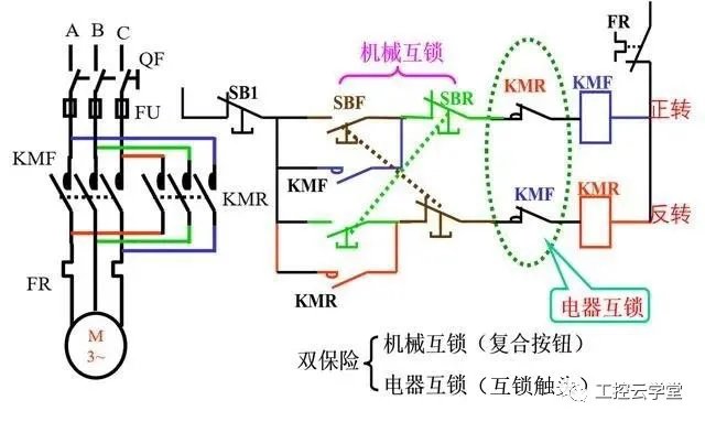 互锁实物接线图 工作原理 电机正转时:按动复合按钮SBF,常闭触点切断反转接触器KM2线圈控制回路,接触器KMF线圈得电,电动机得电正转,同时常闭触点KMF断开反转控制回路,与反转形成互锁; 电机反转时,按动复合按钮SBR,常闭触点断开反转控制回路,接触器KMF线圈失电,辅助触点KMF复位,接触器KM2线圈得电,电动机得电反转,同时其辅助触点KMR断开正转控制回路,与正转形成互锁; 联锁控制在继电器、接触器控制装置中,按某种顺序或变化参量的启停方式称为连锁控制。比如上面这个电路,电机要实现正转就必须热保护正常、启动按钮启动、反转按钮不动作、反转接触器不能动作,他们之间就是联锁关系。 或者在数控中机床要执行程序时,必须要润滑系统、、液压系统、气压系统都启动正常后,机床加工程序才能运行,它们之间的关系就是联锁。 联锁与互锁控制区别,联锁是两个或多个设备,其中之一设备运行,受其它设备是否运行制约;互锁是两个设备运行条件,互相制约,就是1号设备运行时,2号设备不能运行。