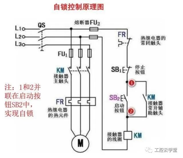 工作原理:当按下按钮SB,交流接触器工作线圈得电吸合,其主触点瞬间闭合,接通三相电源,电动机得电启动运行;当松开按钮SB,交流接触器工作线圈失电断开,主触点瞬间断开,断开三相电源,电动机失电停止运转。 自锁控制自锁控制就是依靠接触器或者继电器自身的常开辅助触点,而使其工作线圈保持通电的现象。它与点动控制最大区别是,点动控制是接通接触器线圈电源后,松开启动按钮后接触器线圈立马断电,电机停止;而自锁控制,当接触器线圈得电后,松开启动按钮,接触器线圈依然保持通电。 自锁控制在控制电路中可以起到很好的失压和欠压保护作用,当电路电源由于某种原因,导致电压下降,电压低于85%时,接触器的电磁系统所产生的电磁力克服不了弹簧的反作用力,因而释放,主触点打开,自动切断主电路,达到欠压保护。 当电路断电时,接触器工作线圈失电释放,自锁触点断开,当再次来电时,电机不会立刻启动,必须重新按动启动按钮SB,电机才能再次工作,起到失压保护。 自锁控制原理图