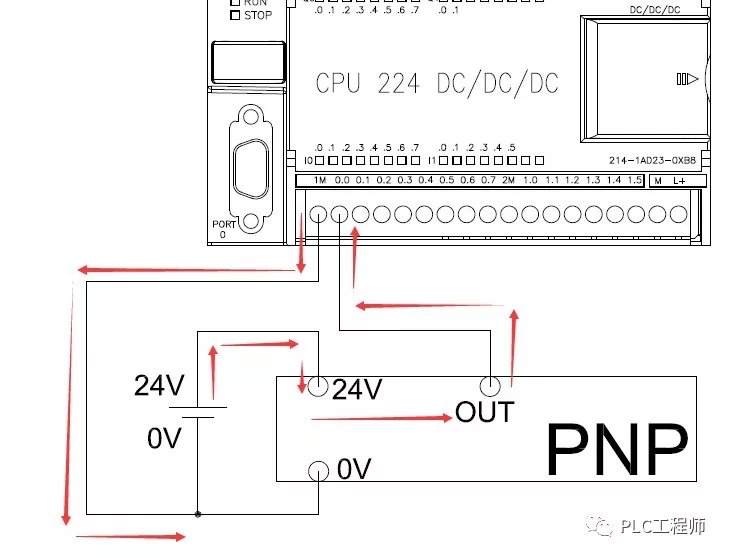 举例个S7-200PLC的NPN、PNP传感器的接线方式 1、首先了解下PLC输入端的类型 西门子PLC输入端源型和漏型的定义:源型、漏型是根据PLC接线端子上 I 点的电流流向来区分的微信公众号PLC工程师(西门子PLC与三菱PLC的定义相反,三菱PLC定义:源型、漏型是根据COM端电流流向来区分) 源型:电流从I点流出时,意为电流源头; 漏型:电流从I点流入时,意为电流流向处; 2、NPN传感器接入PLC(对于西门子PLC来说是源型输入接法) 电流走向:24V+----COM端----I0.0(电流从I点流出)----传感器out端----传感器0V端----0V,如下图:  3、PNP传感器接入PLC(对于西门子PLC来说是漏型输入接法) 电流走向:24V+---传感器24V----传感器out端----I0.0(电流流入I点)----COM----0V,如下图: