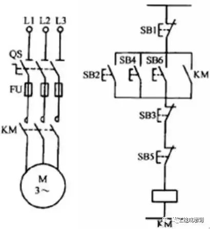58、多点控制电路的工作原理 按下SB2、SB4、SB6中的任何一个按钮,KM线圈就得电,KM就吸合并自保,电机运行;按下SB1、SB3、SB5中的任何一个按钮,KM线圈就失电,KM就断开,电机就慢慢停转。