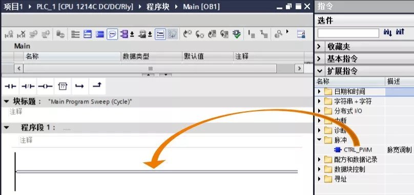 1. 在Portal软件中打开程序块,进行PWM的编程。在指令选件中的“扩展指令”中的“脉冲”文件夹中可以找到CTRL_PWM指令。可以通过双击指令或是拖拽的方式把CTRL_PWM指令放到程序编辑区。如下图所示: