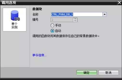 2. 在插入CTRL_PWM指令时会提示关联背景数据块,如下图所示,该数据块的名称和编号可以由用户手动设置,也可以选择系统默认值。