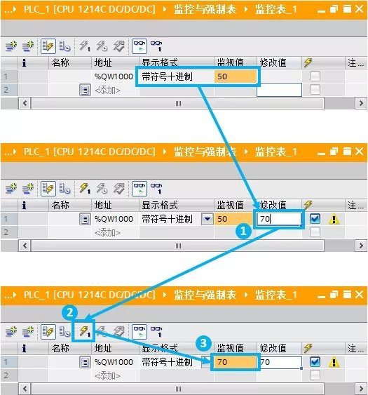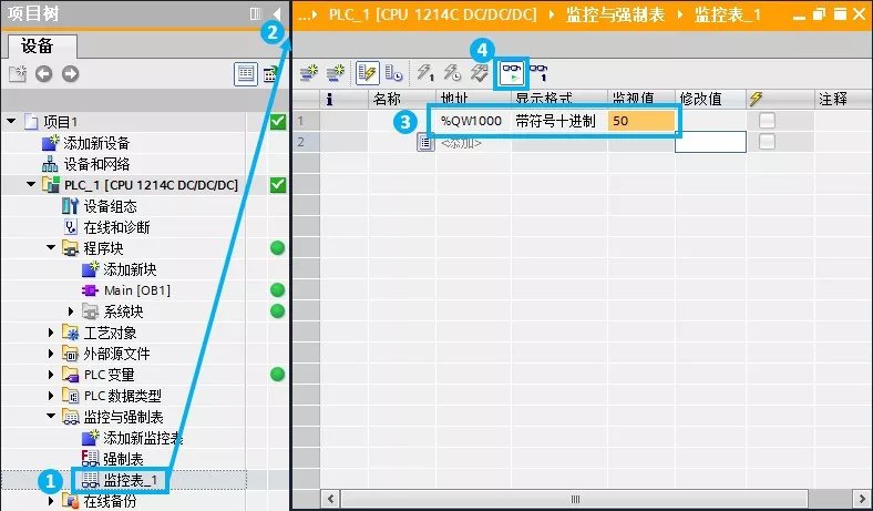 如下图所示,① 在Portal软件左侧项目树中的“监控与强制表”中插入一个新的监控表,②在打开的空白监控表中的“地址”列手动输入QW1000,如然后在“显示格式”一列选择“带符号十进制”,如下图步骤③所示。点击监控按钮,如图中④ 所示,可以看到QW1000的监控值为50,该值是组态PWM时设置的初始脉冲宽度值。 用户可以在监控表中直接修改QW1000的数值来实时更改PWM的脉冲宽度(占空比),如下图所示。 用户可以根据需要进行测试实验。