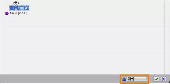 c. 组织块:用来设置PWM I/O地址的更新方式是基于哪个OB块的。用户可以根据需要通过“新增”按钮来添加相应的OB块,如下图所示,本例中用户可以选择默认选项“自动更新”。 d. 过程映像:设置PWM的I/O地址的过程映像的更新情况,这里的“PWM的I/O地址”指的是PWM周期脉冲宽度数值存放的地址。该选项用来设置脉冲宽度地址的更新情况。如下图所示: