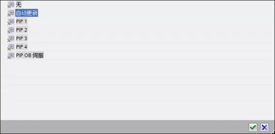S7-1200提供了6个过程映像分区。第一个过程映像分区“自动更新”指定用于每个扫描周期都自动更新的I/O,此为默认分配;接下来的4个分区PIP1、PIP2、PIP3和PIP4可用于将I/O过程映像更新分配给不同的中断事件。“PIP OB 伺服”是给S7-1200运动控制的等时同步模式使用的。