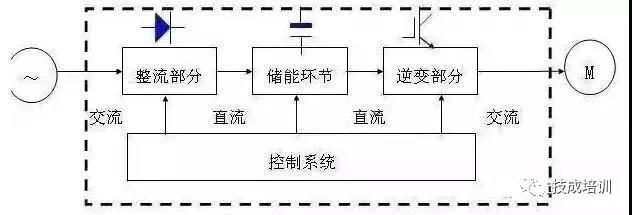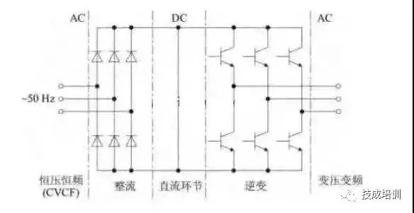 交—直—交变频器则是先把交流电经整流器先整流成直流电,直流中间电路对整流电路的输出进行平滑滤波,再经过逆变器把这个直流电流变成频率和电压都可变的交流电。