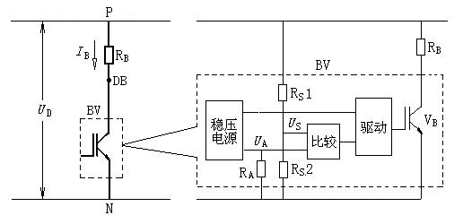 制动电阻的粗略算法 制动电阻值 RB=UD/IB(IB=IMN→TB≈TMN) 制动电阻的消耗功率 PB0=UD2/RB 制动电阻的容量选择 PB=αB •PB0 αB──制动电阻容量的修正系数。在一般情况下: αB=0.3~0.5 电动机容量小时取小值,大时取大值。 3、制动单元的构成与设计 (1)制动单元的功能与构成如图所示:
