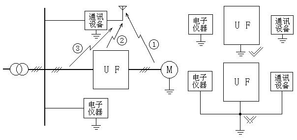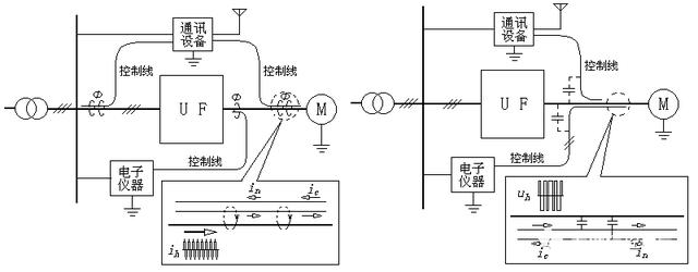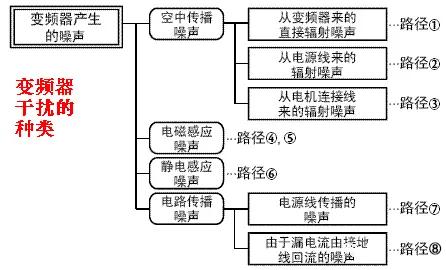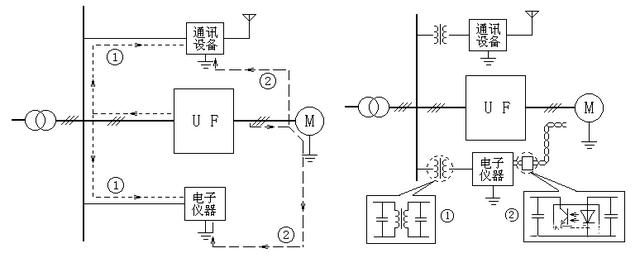 (1)干扰信号的传播方式 电路耦合方式 即通过电源网络传播,这是变频器输入电流干扰信号的主要传播方式,如下图。