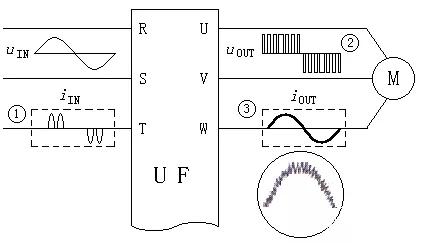 交-直流电抗器 4、变频器的抗干扰 变频器的电压、电流波形如下图所示: