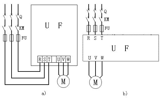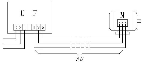 二、主电路线径的选择 1、电源与变频器之间的导线 和同容量普通电动机的电线选择方法相同。 要求:ΔU≤(2~3)%UN 2、变频器与电动机之间的导线,如下图所示: