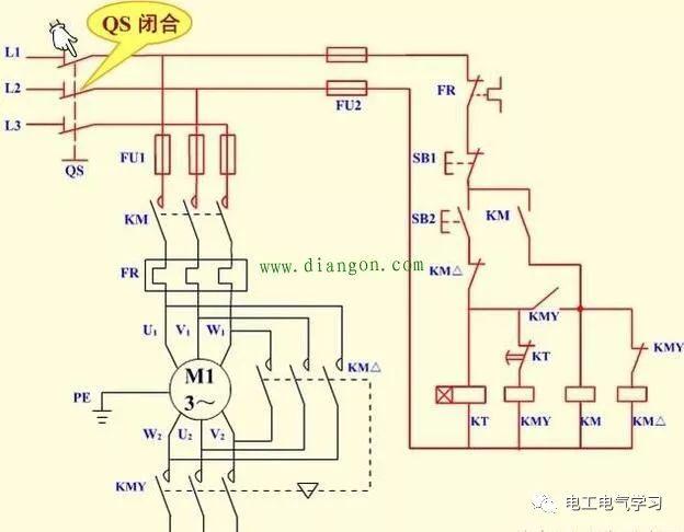 下面我们看这个如何运作的,按下SB2启动按钮以后KT-----KM----KMY 三个电气元件同时得电,这时候电机星形运行,当时间继电器到达我们设定时间以后延时断开触点断开对KMY电路,KMY失电,这时候KMY接触器回复初始状态,KM△得电吸合,同时分段对KT的互锁,KT---KMY失电,这时候电机全压运行。这个电路就是时间继电器不用一直得电。