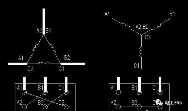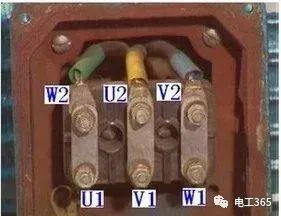 电动机接线简单示意图 图中为什么W2下面不是W1,而是U1呢?其实,就是为了方便接线,如果一一对应的排布,尤其在三角形接线时,会非常不方便。如下图: