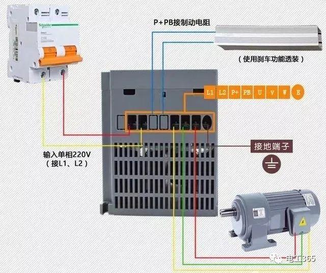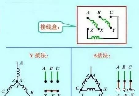 接线盒中六个接线头关系示意图 如上面实物图中我们也看到了,三相电动机的接线盒内有上下两排接线柱,我们通过上面这个“接头关系示意图”来进一步说明它们的关系,暂且把三相绕组这六个接线头分别标记为符号D1 、 D2 、 D3 、 D4 、 D5 、 D6 ,其中 D1 和 D4 、 D2 和 D5 、 D3 和 D6 各为一相,其实就是同一根线的两头而已,每一根线称为一相绕组,三根就称为 A 、 B 、 C 三相绕组。之所以重申这一点,是因为很多人容易被这里绕晕了。 2.220/380V电机如何接线 380V是工业用电电压,220V是家庭用电电压。如果铭牌上标着电压220/380V,接法△/Y,是告知使用者该电动机可以在三相220V电源条件下接成三角接法,在三相380V的电源条件下以星形接法使用,适应两种不同的电压。 如果电源电压是220V,就应接成三角形。如误接成星形,就会使接到每相绕组上的电压由220V下降到220/√3=127V,电动机就会因电压太低起动不起来,如仍承受额定负载,就容易造成过载烧毁。 如果电源电压是380V,就应接成星形,如误接成三角形,每相绕组就会承受380V的电压而造成定子电流增大烧毁绕组。所以正确的接线方式,应能使电动机在正常工作时,所承受的电源电压必须等于或接近于电动机的额定电压。 380V的接线方法,有三根相线,没有零线,全是火线,我们已经在上面说明了它的接线方法。家庭220V的则有两根线,一根火线,一根零线,它怎么接到接线盒中的三根接线柱上呢?或者怎么让电机动起来呢?给大家分享两种方法。 变频器控制电机使用起来很方便而且可以设置的很智能,现在市场上有很多单相输入变为三相输出的变频器。下面仅提供两张参考图,大家一看便懂。