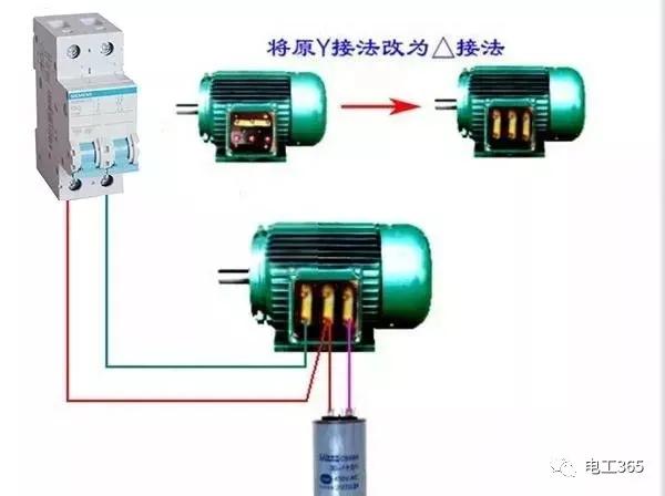 电机三相供电改为两相供电 单相电动机工作原理:两个在空间互差90度电角度的绕组,产生的磁通轴线在空间也互差90度电角度,再通以不同相位的电流就能产生二相旋转磁场,从而能产生启动转矩使电动机动起来。