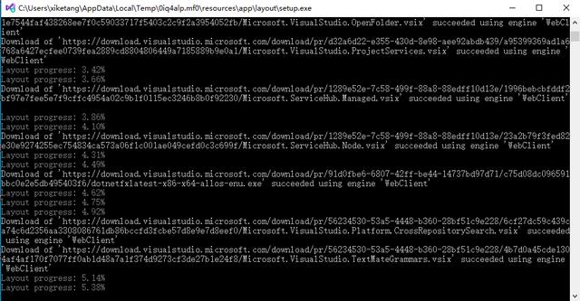 5、执行命令 把下方的命令复制到PowerShell中,记住前面要有.\,表示当前路径下,复制完成后按下Enter,执行一下即可。 .\vs_professional__1470957165.1573205937.exe --layout d:\vs2019_offline --add Microsoft.VisualStudio.Workload.ManagedDesktop --add Microsoft.VisualStudio.Workload.CoreEditor --add Microsoft.VisualStudio.Workload.NativeDesktop --add Microsoft.VisualStudio.Workload.NetCoreTools --add Microsoft.VisualStudio.Workload.Universal --add Microsoft.VisualStudio.Workload.VisualStudioExtension --add Component.GitHub.VisualStudio --lang zh-CN6、执行过程