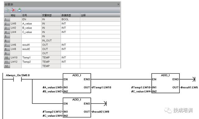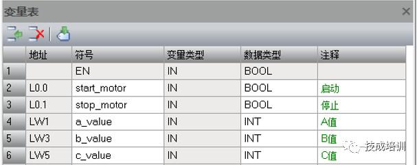 变量类型IN_OUT称为输入输出变量类型,是一个可读可写的变量即可读取他的值传递给子程序内部的运算,也可把运算完的结果输出放入到该变量中,比如说我们用到的自加1指令或是启保停电路中用于输出和自保持的变量就需要用到该变量。该变量建立后,在调用子程序时位于子程序的左侧,由于该地址需要存储子程序运算完的结果,所以在赋予实参时不允许使用常数和指针作。