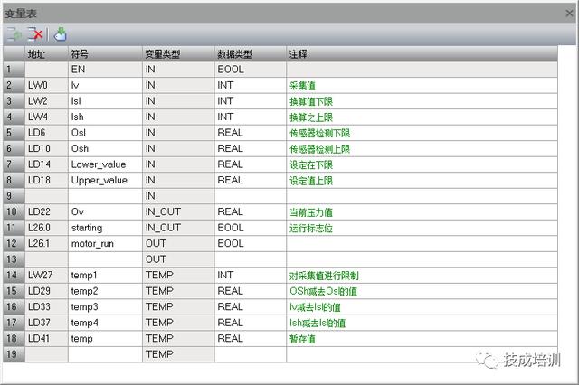 对于电机的运行标志位,在低压下限设定值时启动,高于上限设定值时停止,在两个限制值之间时需要进行自保持,所以需要用到他的触点进行自锁,这也是一个可读可写的变量,同样建为IN_OUT的变量类型。