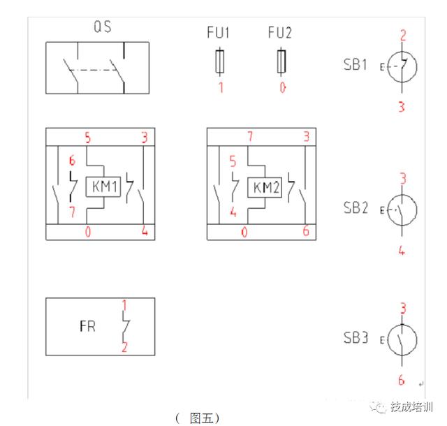 四.整理号码 整理号码相对复杂电路而言, 目的是使布置图上相同的号码趋于集中 便于接线,(尽量使“同号”相邻或处于器件的同侧)整理号码根 据”填号定则 ”进行。 填号定则: 1.布置图中一个元件两端号码对调,原电路不变。 2.同一个器件上功能相同的元件,左边与右边号码整对互换原电路 不变。 五.接线 按接线图(如图五)固定好器件,再将图上相同 号码的端子用导线联接起来安装就完成了,相信你能行。
