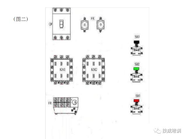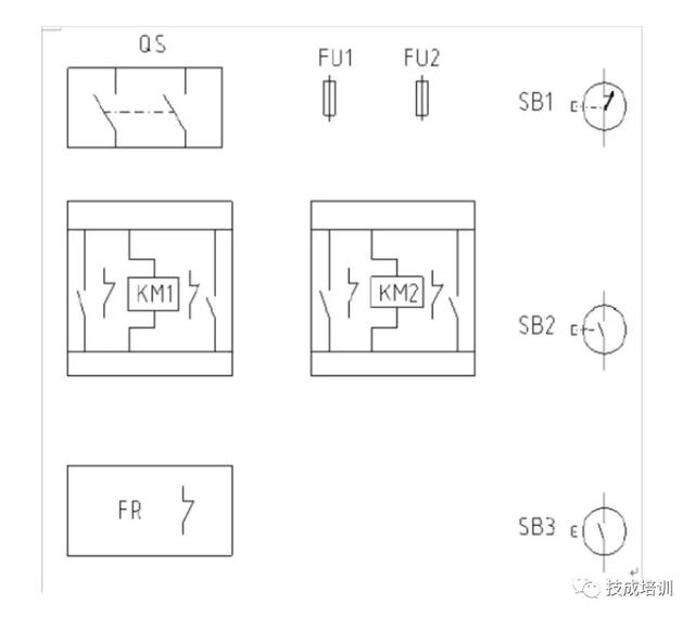 一个复杂的电气控制原理图要怎么才能变成我们需要的接线图呢?想解答这个问题,先要搞清楚的是两种图文之间转换的步骤,如下: 1.绘制接线平面布置图 2. 原理图上编号 3.平面图上填号 4.固定器件、号码联接(安装完毕) 整理号码 了解其中的流程后,我们以正反转电路为例来介绍电气原理图与接线图的转换方法。 一.绘制接线平面布置图 拿到原理图先看上面有哪些器件,设计一下这些器件位置如何安放,根据柜(盘)空间绘制平面布置图,如下面由原理图(图一)到实物布置图(图二)