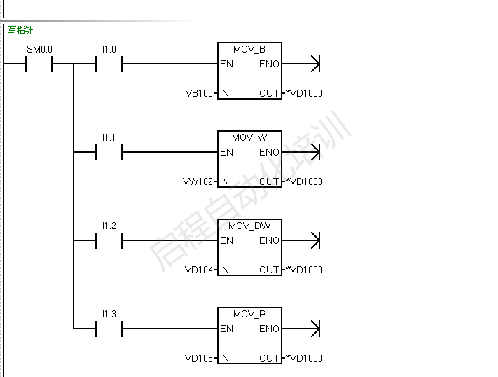 将VB100的数据传送给地址VD1000对应的字节 即传给VB10 将VW102的数据传送给地址VD1000开始的字 即传给VW10 将浮点数VD108的数据传送给地址VD1000开始的双字 即传给VD10 将VD104的数据传送给地址VD1000开始的双字 即传给VD10