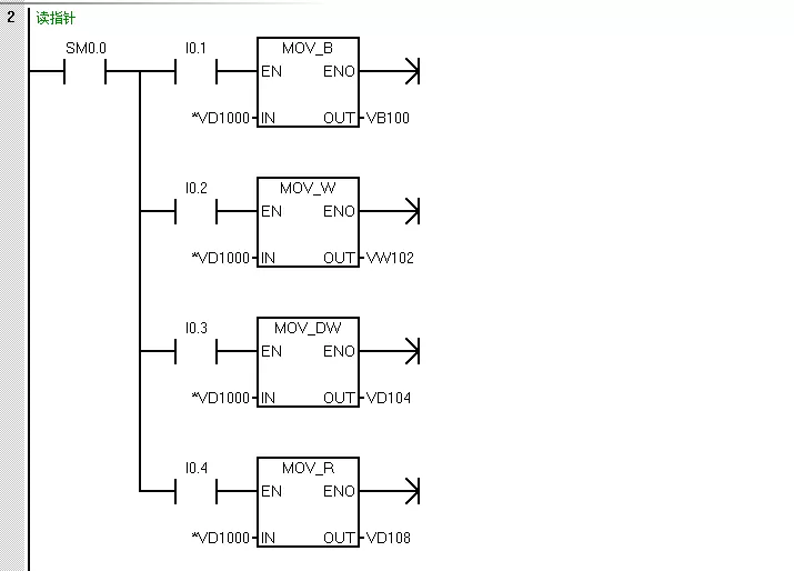 读双字VD10的数据存到双字VD04中 读字VW10的数据存到VW102中 读双字VD10的数据存到浮点数VD108中 读字节VB10的数据存到VB100中