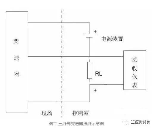 图一 两线制变送器接线示意图 两线制变送器如图一所示,其供电为24V DC,输出信号为4-20mA DC,负载电阻为250Ω,24V电源的负线电位最低,它就是信号公共线,对于智能变送器还可在4-20mA DC信号上加载HART协议的FSK键控信号。 二、 三线制 有的仪表厂为了减小变送器的体积和重量、并提高抗干扰性能、减化接线,而把变送器的供电由220V AC改为低压直流供电,如电源从24V DC电源箱取用,由于低压供电就为负线共用创造了条件,这样就有了三线制的变送器产品。