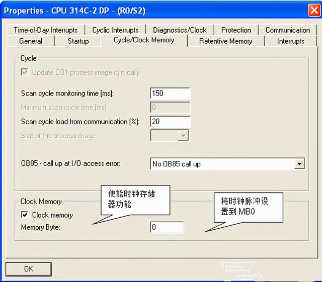 为了编程方便,我们使用时钟脉冲激活通信任务,在CPU的“Properties”>“Cycle/Clock Memory”中设置,如图5所示。